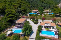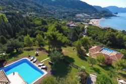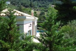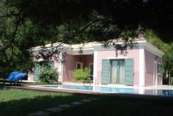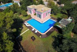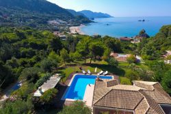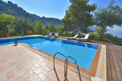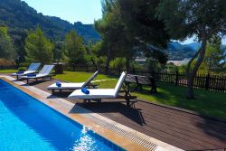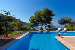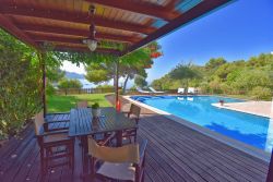 Private BBQ with pergola in the beautiful garden, outdoor dining area, a large private pool (4.5 x 17 m) surrounded by terraces with wooden sun loungers and chairs overlooking the Ionian Sea.
