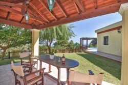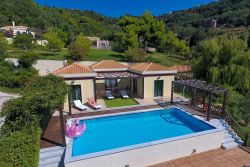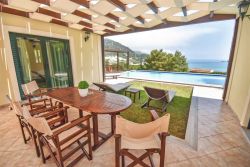 Privater Grill mit Pergola im schönen Garten, Essbereich im Freien, ein großer privater Pool (4,5 x 17 m), umgeben von Terrassen mit hölzernen Sonnenliegen und Stühlen mit Blick auf das Ionische Meer.