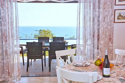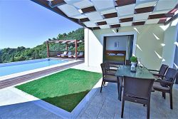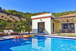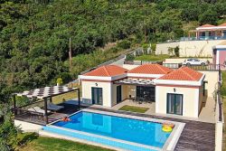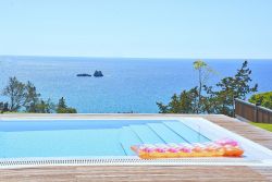 Espace repas extérieur, une grande piscine privée (5 x 10 m) entourée de terrasses avec chaises longues et chaises en bois surplombant la mer Ionienne.