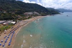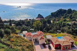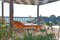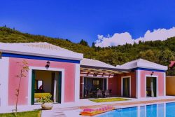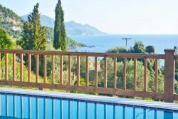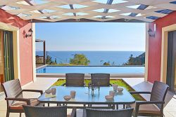 Espace repas extérieur, une grande piscine privée (5 x 10 m) entourée de terrasses avec chaises longues et chaises en bois surplombant la mer Ionienne.